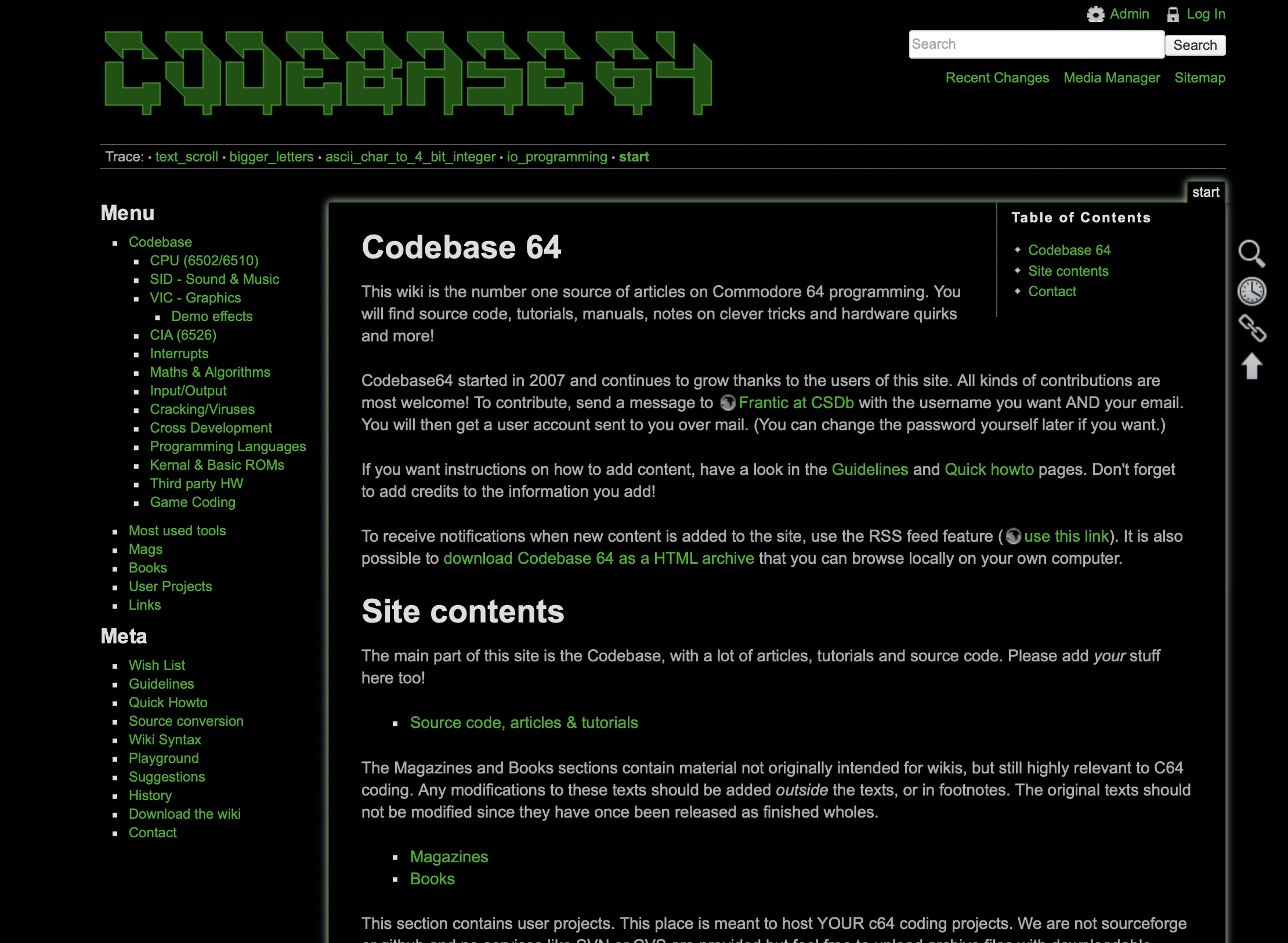 Codebase 64 This wiki is the number one source of articles on Commodore 64 programming. You will find source code, tutorials, manuals, notes on clever tricks and hardware quirks and more!