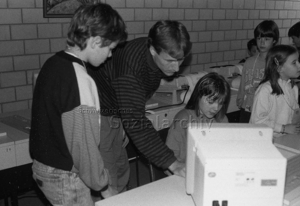 "Ferienpass/Computer Grafik" - Ein Kursleiter gibt Instruktionen, Kinder am Computer; 1990